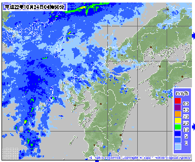 | AM4:00に目覚ましセットしてたんですが、起きたのはAM4:30。 何故だ!?(爆 自宅を出発前に気象庁のサイトで雨の状況を確認・・・ こりゃ〜山口県もそろそろ降ってくるぞ!(爆 ちなみにAM4:30に起きたのは、雨音のせいです。(^^;; イベントの中止の最終連絡はAM5:00に下関市のホームページで発表! という事だったので、チェックしました。 予定通り開催するらしい・・・しかし、受付、スタート等の時刻を 30分前倒しとの事。 ”前倒し!?” おいおい・・とバタバタ急いで準備しました。(^^;; |