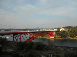 店内(客室のテーブル)からの眺め♪ 5号橋の松島橋が赤く輝いてます。 良い眺め♪ |