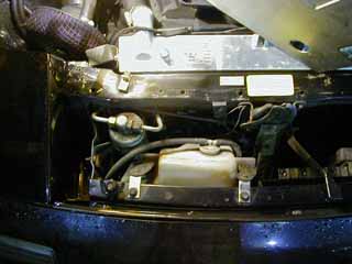 | まずは後期用のタンクを外します。 右の画像は外した後の写真です。 これでダイレクトにエアコンのコンデンサーに 風が当たるようになりました。(^^ゞ #水温も下がる事、間違いないでしょうけど・・。(笑) |