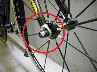 | 取付場所はココ。 赤○部分に装着します。 クイックレバーの反対側のキャップ部です。 |