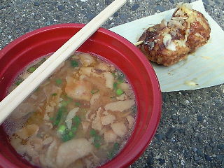 | 長蛇の列に並ぶのが嫌だったので、 トン汁&タコ焼きのみを頂きました♪ ココまではターボぅさんの前後を走行し、 一緒に昼食摂ったのですが、 ココからは寂しい(?)一人旅状態・・・。(^^;; |
