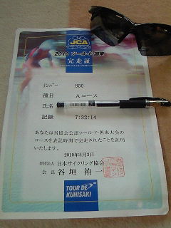 | ゴール直後に貰った完走証。 時間は・・・7時間32分。 8時間完走だから、ギリギリやんか。。(^^;; 写真は帰宅して撮影したものです。 日本サイクリング協会会長・・・谷垣 禎一 現自由民主党総裁な方ですね。(汗 |