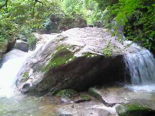 上の看板から、10mくらい川の方へ 下りたとこに小さい滝がありました。 滝というより、大きな石が川の流れを 堰きとめてる感じですね。(苦笑 でも、マイナスイオン・・・ BIKEで熱くなった私の体はひんやり感じました。 夏のちょいと休憩するにはイイとこかもね? (駐車場はありませんけど。。。) |