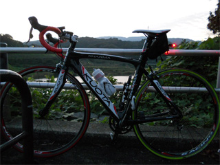| 今日は”TT”せずにサイクリング気分で 一気に上りました。 はい、TTのスタートのアタック前に心拍数を 下げる為、少々休憩するんですが、 今日はそんな時間的余裕はありませんでした。(^^;; 無事に河内ダム到着! 昨日交換した赤いバーテープがキラリ♪ |