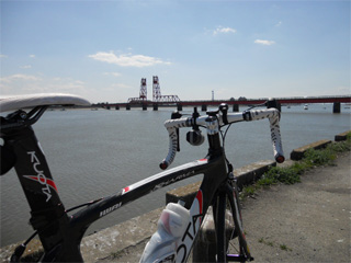 サドルと昇開橋のアングル♪ ってか、今日は風が強くて自転車を立てられない。(爆 (自転車を手で固定しての撮影です。) |