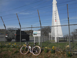 麓から見えていたへんな形のアンテナ。 航空自衛隊のレーダーだったんですね。 自衛隊の敷地内には入れませんが、 敷地の横に公園(?)があり、駐車場があります。 装甲車みたいなのとロケットみたいなモニュメントと 記念撮影です。(笑 水仙の花が咲いてました。 (そういえば途中、菜の花も咲いてたな♪) やはり山頂付近は寒いんでしょうね。(^^;; |
